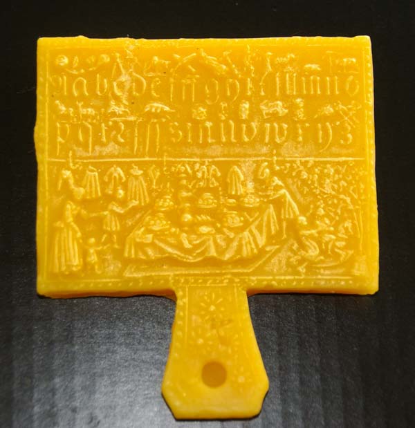 What an incredible hornbook in beeswax this is! Measuring approximately 6" x 6" and weighing almost 6 oz. This original design was actually an antique springerle mold (cookie) from which I had a professional silicone mold designed for beeswax. Such incredible detail: